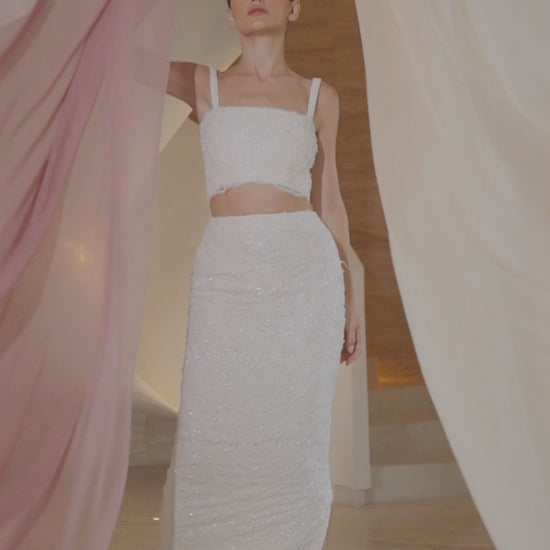 Two piece set/ white beaded embroidered cropped top and ankle length skirt