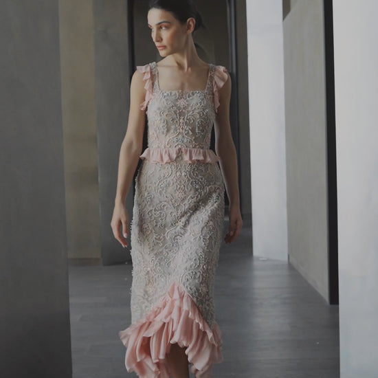 Pale grey/ pastel pink Beaded embroidered lace ankle length dress.